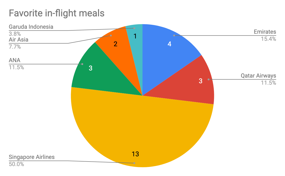 This pie chart shows the percentage of people’s favorite airline meal. 50% of them said that Singapore Airlines had the best food. Second place goes to Emirates. Garuda Indonesia ranks in the bottom with only 1 vote after budget airline AirAsia.